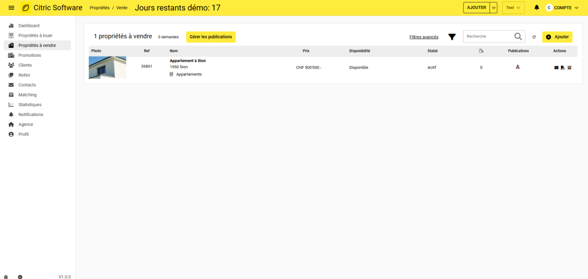 Saisie et gestion des biens immobiliers et des clients directement sur CITRIC, pour les personnes qui veulent faire simple. Publication de vos annonces sur les différents portails immobiliers en Suisse, avec solution d’automatisation ou publication manuelle selon le bien.